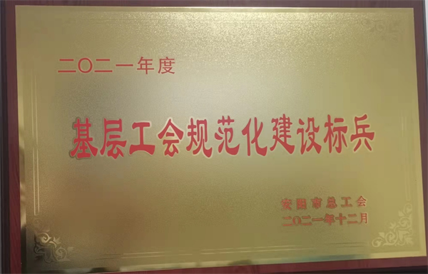 近日,公司工會被安陽市總工會授予“2021年度安陽市基層工會規(guī)范化建設(shè)標兵”榮譽稱號。