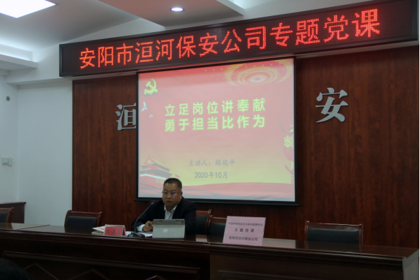 為進(jìn)一步提升黨員干部的黨性修養(yǎng)與政治素質(zhì),激勵以追求卓越、只爭朝夕的精神,擔(dān)當(dāng)作為、勇于奉獻(xiàn),努力建設(shè)新時代一流保安隊伍。2020年10月30日下午4時,在南二樓會議室,公司黨委組織召開了《立足崗位講奉獻(xiàn)、勇于擔(dān)當(dāng)比作為》專題黨課,黨課由第四黨支部書記楊現(xiàn)平為大家講授。公司黨委書記王高峰,黨委副書記張錫軍,黨委委員高代獻(xiàn)、魏東、楊克忠,總經(jīng)理助理以及各黨支部書記、副書記、入黨積極分子代表40余人聆聽了黨課。黨課由張錫軍同志主持。