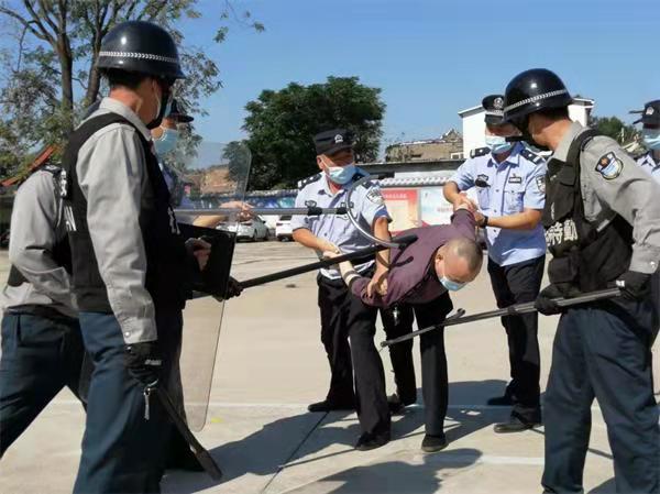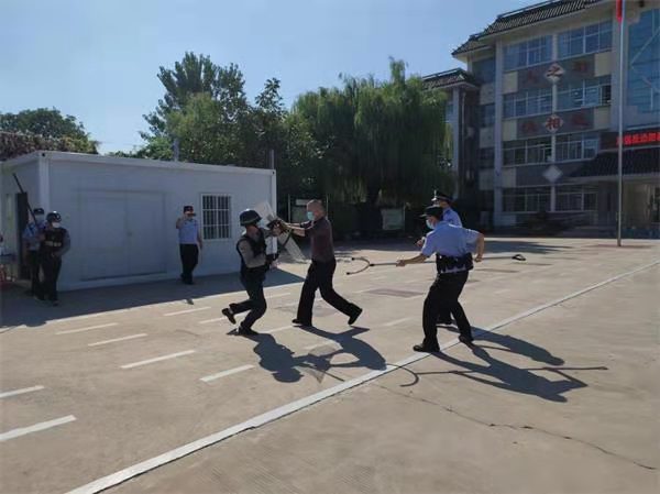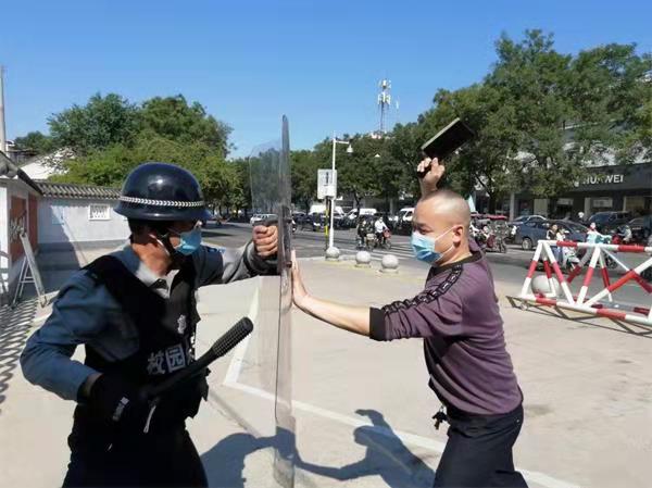一名“恐暴”分子到學(xué)校門崗尋釁滋事,與門崗保安隊員發(fā)生沖突,暴徒手持菜刀闖進校園。學(xué)校兩名保安手持鋼叉、盾牌與恐暴分子發(fā)生對峙,另一名保安按響了一健報警裝置,110指揮中心接到報警后,立即出動警力趕赴現(xiàn)場,學(xué)校保安和民警協(xié)同作戰(zhàn),成功將闖入校園的暴恐“歹徒”制服。整個演練過程緊湊、嚴肅逼真,受到了學(xué)校和派出所領(lǐng)導(dǎo)的表揚。