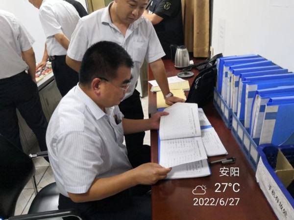 在檢查中,韋洪東詳細查看了大隊談心記錄、跟車、槍彈保養(yǎng)和預案演練等各項臺賬,還查看了大隊防疫記錄和守庫押運登記本。并對守押要害崗位審查表進行排查。在守庫室,張新平查看了槍彈的數(shù)量、存放和槍彈庫分離的改造,檢查了消防和報警設備,現(xiàn)場查看了守庫室和車輛的衛(wèi)生情況。