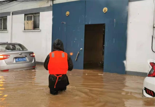 2021年7月22日早上7點(diǎn)左右,安陽(yáng)幸福路工行憑證庫(kù)房值班隊(duì)員告急,由于下雨急,積水深,庫(kù)房有雨水倒灌情況。鄭芳軍隊(duì)長(zhǎng)接到救援電話后,憑證庫(kù)房是工行的票據(jù)重地,汛情就是命令,立即組織6名防汛突擊隊(duì)冒著深及脖子的洪水,手拉救生繩,身穿救生衣,冒著生命危險(xiǎn)向憑證庫(kù)房挺進(jìn)。到達(dá)后,發(fā)現(xiàn)庫(kù)房門口水位上升,他們及時(shí)將票據(jù)挪到安全位置,防止浸泡受損,門口用沙袋進(jìn)行封堵,確保了憑證庫(kù)房安全??吹桨踩怂麄冇猪樤访坝晏仕谕砩?0點(diǎn)安全返回市行門崗。