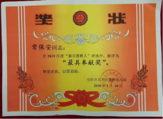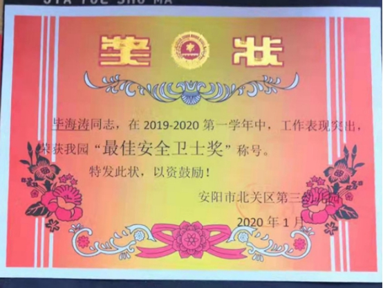 獲獎(jiǎng)隊(duì)員中,駐北關(guān)區(qū)區(qū)直幼兒園張強(qiáng)在2019年度“不忘初心 花開(kāi)綻放 美麗北幼人”評(píng)選活動(dòng)中,榮獲“美麗奉獻(xiàn)獎(jiǎng)”;駐北關(guān)區(qū)博雅幼兒園常保安在“美麗博雅人”評(píng)選中,被評(píng)為“杰出奉獻(xiàn)獎(jiǎng)”;駐北關(guān)區(qū)第三幼兒園畢海濤榮獲“杰出安全衛(wèi)士獎(jiǎng)”稱(chēng)號(hào)。自該大隊(duì)擔(dān)負(fù)北關(guān)區(qū)教育系統(tǒng)安全保衛(wèi)工作以來(lái),駐各小學(xué)、幼兒園保安員夯實(shí)保安技能,開(kāi)展應(yīng)急處置預(yù)案演練,認(rèn)真履行職責(zé),為創(chuàng)建平安校園做出了突出貢獻(xiàn)。