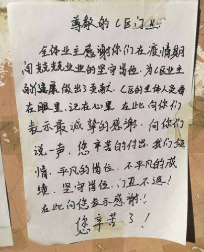 第六天,帕堤歐小區(qū)的一位住戶說“平日里,我們對保安的工作沒有特別在意,這次疫情期間,我看到了保安真是少不了??!”為此,這里的業(yè)主在2月16日下午,聯(lián)名給保安寫了一封感謝信。感謝他們?yōu)闃I(yè)主的健康,為小區(qū)的平安,作出的貢獻(xiàn)。