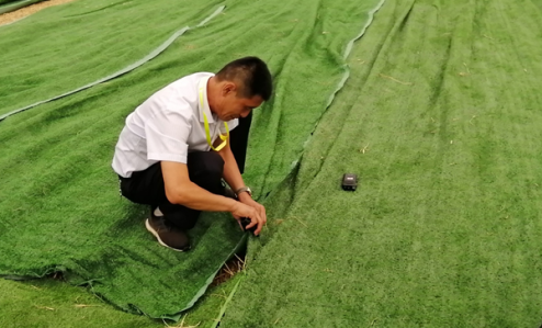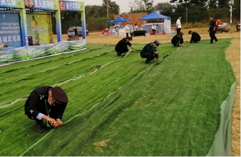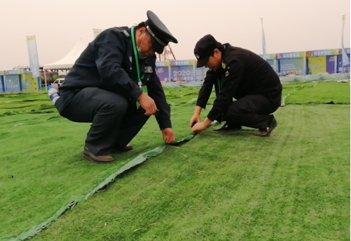 被抽調(diào)出的執(zhí)勤人員分工合作,有的負責鋪平草坪地毯,有的負責將地毯用訂書釘釘在一起,大家干得熱火朝天。經(jīng)過2個多小時奮戰(zhàn),13500平方米凌亂的草坪地毯再次整整齊齊鋪在了主會場??蛻艨吹胶?,直夸我們的保安員真能干。