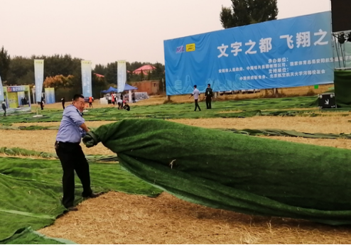 “把這邊拉整齊?!薄拔疫@里已經(jīng)鋪平了?!?月30日下午,第十二屆安陽航空運動文化旅游節(jié)主會場,在執(zhí)勤的公司保安員應客戶要求忙著整理會場上草坪地毯。