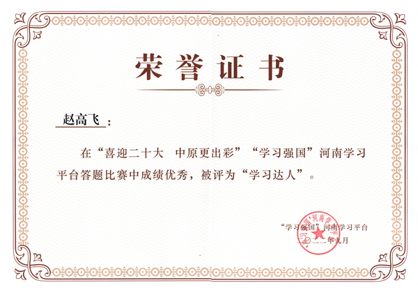 對于平時怎樣學(xué)習(xí),趙高飛有自己的學(xué)習(xí)心得,他認(rèn)為,學(xué)習(xí)要貴在勤奮、貴在鉆研、貴在有恒,每天早上第一件事,就是打開學(xué)習(xí)強(qiáng)國平臺,翻閱感興趣的時事新聞和行業(yè)動態(tài),完成每天的學(xué)習(xí)任務(wù),從不占用工作時間學(xué)習(xí),都是在上班之前就完成了。對于參加比賽如何獲得好的成績,趙高飛有一套自己的學(xué)習(xí)竅門。一是要堅持,每天堅持把當(dāng)日學(xué)習(xí)積分做完,總結(jié)學(xué)習(xí)方法和學(xué)習(xí)技巧。二是勤練習(xí),四人賽、雙人對戰(zhàn)是關(guān)鍵,要勤練習(xí)各個答題模塊,熟能生巧。三是有訣竅,他整理出一整套學(xué)習(xí)題庫達(dá)5000多題,并利用碎片時間翻看熟記于心,他把各種類型的題分類總結(jié),錯題、易錯題收藏起來,反復(fù)練習(xí)、各個擊破,最終,他克服一切困難,集中一切精力用5個小時時間,通關(guān)“強(qiáng)國總題庫”共4202題。四是重交流,他加入了“學(xué)習(xí)強(qiáng)國”全國學(xué)習(xí)聯(lián)盟、“學(xué)習(xí)強(qiáng)國”河南學(xué)習(xí)聯(lián)盟等學(xué)習(xí)微信群,和學(xué)習(xí)達(dá)人們一起探討答題經(jīng)驗和技巧