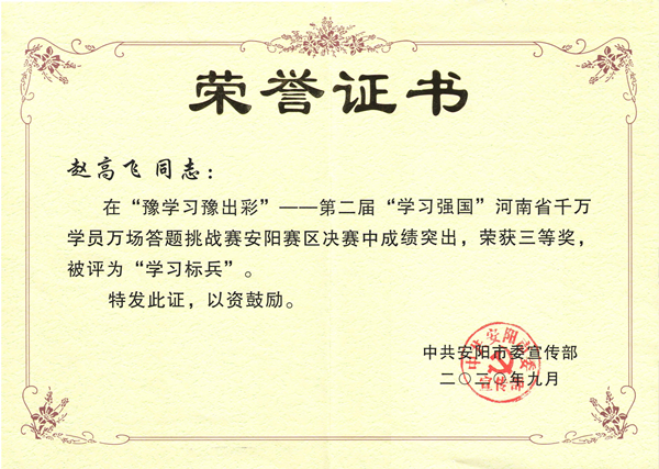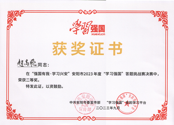 趙高飛,35歲,中共黨員,本科學(xué)歷,現(xiàn)任鼎信子公司副經(jīng)理,自“學(xué)習(xí)強(qiáng)國”平臺上線以來,趙高飛學(xué)習(xí)成績屢創(chuàng)新高,先后榮獲2020年度學(xué)習(xí)強(qiáng)國挑戰(zhàn)賽安陽市賽區(qū)決賽“個人三等獎”,2021年度安陽市黨員干部在線答題競賽“個人三等獎”,2022年度學(xué)習(xí)強(qiáng)國河南學(xué)習(xí)平臺“喜迎二十大、中原更出彩”答題比賽“周達(dá)人”及“學(xué)習(xí)達(dá)人”,2023年度“強(qiáng)國有我 學(xué)習(xí)興安”學(xué)習(xí)強(qiáng)國答題挑戰(zhàn)賽安陽市決賽“個人二等獎”,2023年度學(xué)習(xí)強(qiáng)國河南學(xué)習(xí)平臺“貫徹二十大精神、建設(shè)現(xiàn)代化河南”強(qiáng)國答題比賽“周達(dá)人”。學(xué)習(xí)從來都不是一蹴而就的,這些成績的獲得,是趙高飛日積月累堅持學(xué)習(xí)的成果。