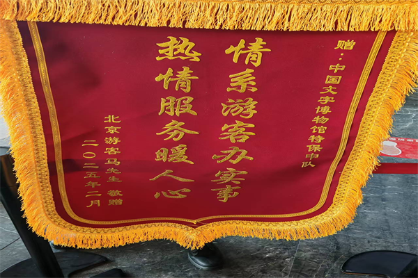 2月16日,一名北京游客將一面“情系游客辦實(shí)事 熱情服務(wù)暖人心”的錦旗送到特保大隊(duì)派駐中國(guó)文字博物館特保中隊(duì),表達(dá)對(duì)特保隊(duì)員不顧恐高、幫助找到墜落無(wú)人機(jī)的感激之情。
