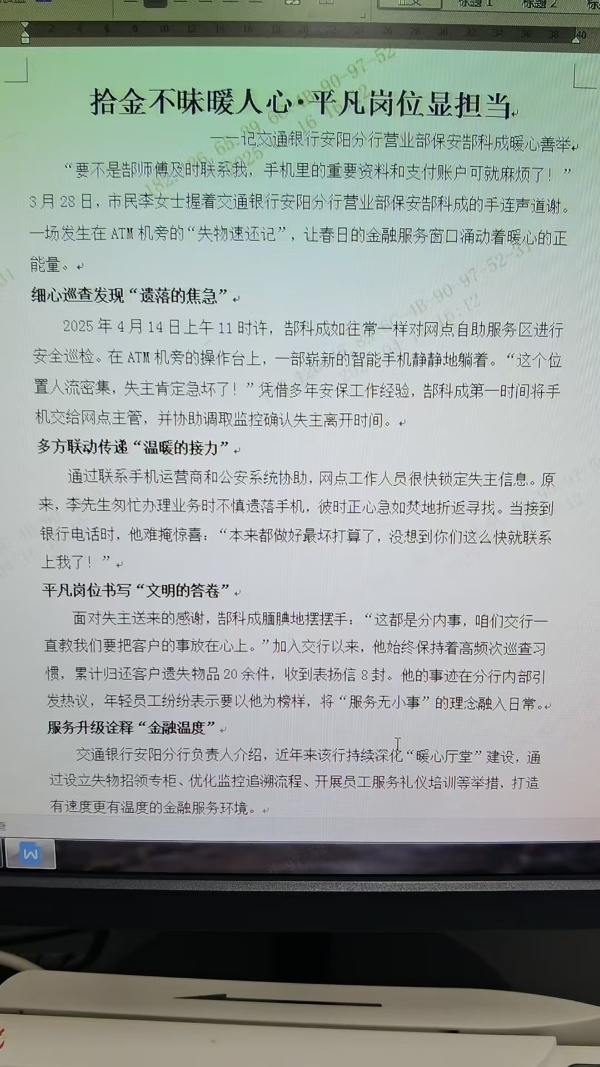 近日,交通銀行股份有限公司安陽分行以《拾金不昧暖人心·平凡崗位顯擔(dān)當(dāng)--記交通銀行安陽分行營業(yè)部保安郜科成暖心善舉》為題在安陽分行內(nèi)部網(wǎng)站發(fā)表文章,對(duì)技防分公司保安隊(duì)員郜科成給予高度贊揚(yáng)。
