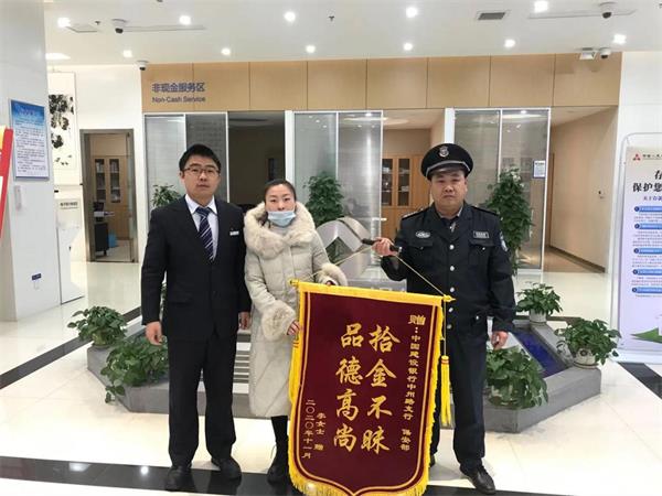 12月2日上午,李女士給中國(guó)建行中州路支行送來(lái)一面錦旗,激動(dòng)地對(duì)行長(zhǎng)說(shuō)。“太感謝你們了,如果不是建行保安大哥品德高尚,拾金不昧,我的損失就大了?!?