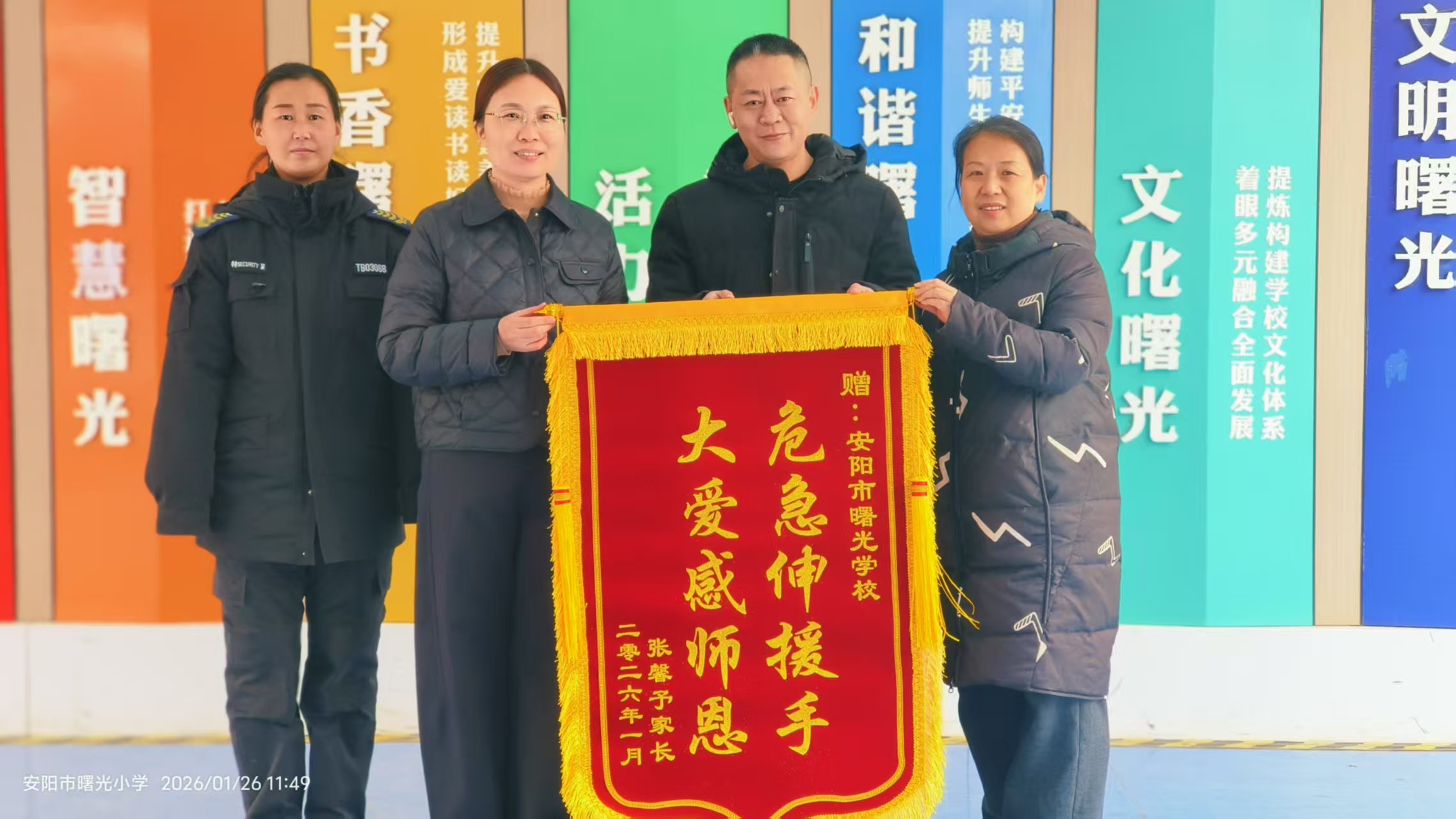 1月26日中午,一面滿載感激的錦旗被送至安陽市曙光學(xué)校,老人家屬緊緊握住校領(lǐng)導(dǎo)的手連連致謝,感謝學(xué)校師生及人防五大隊(duì)駐校保安師娟的緊急施救,為老人挽回生命。這份謝意,源于1月23日中午校門口一場與死神賽跑的暖心救援。